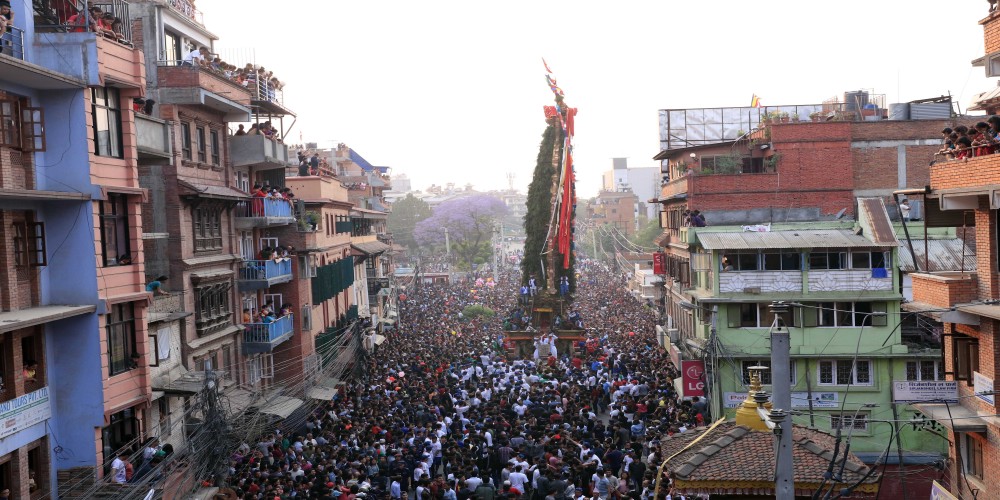 Nepalese Devotees pull the chariot of God of Rain ''Rato Machhindranath'' in Lalitpur, Nepal. Rato Machhindranath Rath Jatra, one of the longest and most interesting festivals in lalitpur, Nepal. Both Hindus and Buddhists in Nepal worship the deity, Rato Machhindranath. Hindus regard him as the reincarnation of the Lord Shiva.Rato Machhindranath is revered as the giver of rain.